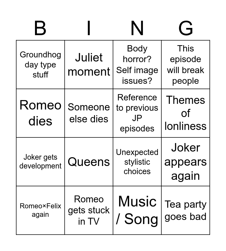 This bingo card has 16 words: Romeo gets stuck in TV, Joker appears again, Body horror? Self image issues?, Groundhog day type stuff, Joker gets development, Juliet moment, Unexpected stylistic choices, Music / Song, Romeo dies, Someone else dies, Romeo×Felix again, This episode will break people, Queens, Themes of lonliness, Reference to previous JP episodes and Tea party goes bad.