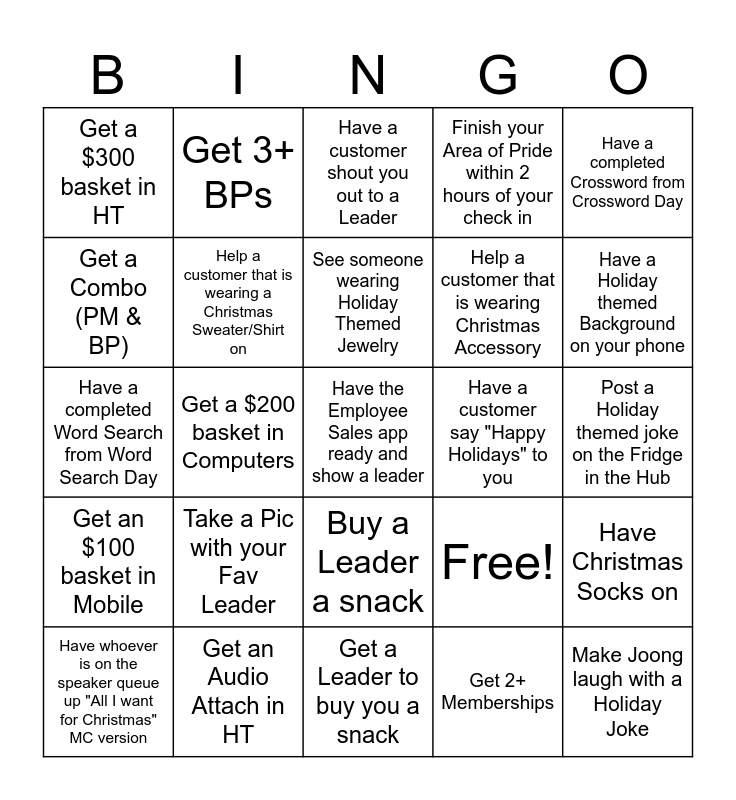 This bingo card has 25 words: Take a Pic with your Fav Leader, Get a Leader to buy you a snack, See someone wearing Holiday Themed Jewelry, Have whoever is on the speaker queue up "All I want for Christmas" MC version, Have a completed Crossword from Crossword Day, Get a $300 basket in HT, Get a Combo (PM & BP), Get 3+ BPs, Have a customer say "Happy Holidays" to you, Buy a Leader a snack, Help a customer that is wearing Christmas Accessory, Have a completed Word Search from Word Search Day, Free!, Have Christmas Socks on, Help a customer that is wearing a Christmas Sweater/Shirt on, Make Joong laugh with a Holiday Joke, Post a Holiday themed joke on the Fridge in the Hub, Have a customer shout you out to a Leader, Have a Holiday themed Background on your phone, Get a $200 basket in Computers, Have the Employee Sales app ready and show a leader, Get an Audio Attach in HT, Get an $100 basket in Mobile, Finish your Area of Pride within 2 hours of your check in and Get 2+ Memberships.
