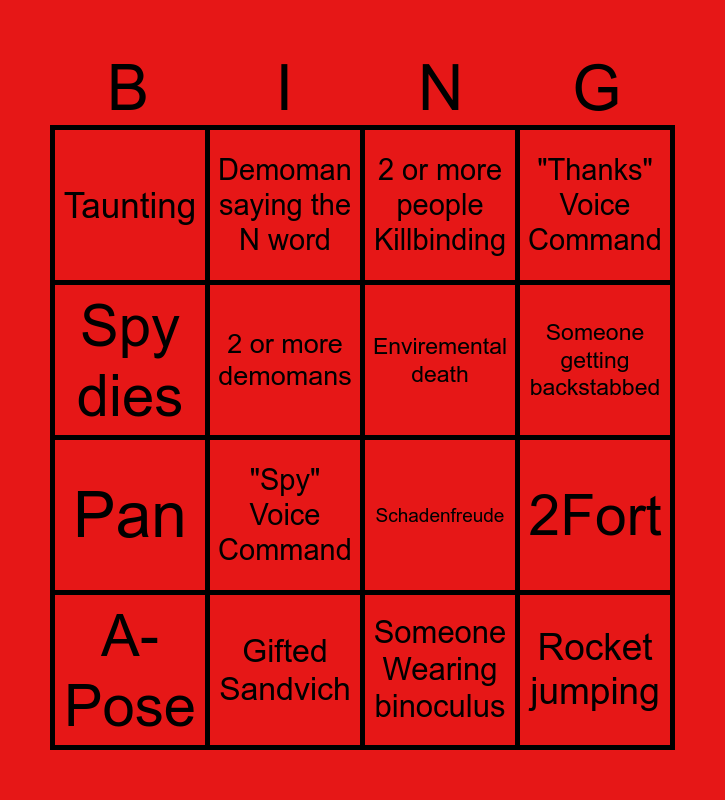 This bingo card has 16 words: Gifted Sandvich, 2Fort, 2 or more people Killbinding, Taunting, Pan, Demoman saying the N word, Schadenfreude, Someone Wearing binoculus, Spy dies, 2 or more demomans, A-Pose, "Thanks" Voice Command, "Spy" Voice Command, Someone getting backstabbed, Enviremental death and Rocket jumping.
