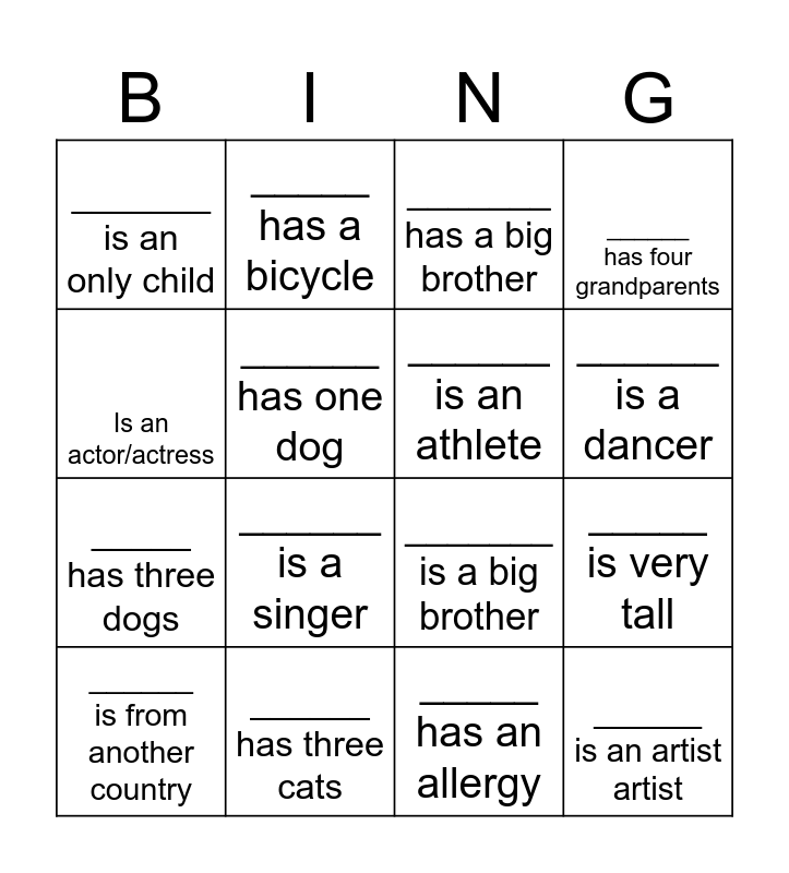 This bingo card has 16 words: ______ has three cats, _____ is very tall, _______ has a big brother, _______ is an only child, _____ has three dogs, _____ has a bicycle, _______ is a big brother, _____ has an allergy, Is an actor/actress, ______ has one dog, ______ is from another country, ______ has four grandparents, ______ is a singer, ______ is a dancer, ______ is an athlete and ______ is an artist artist.