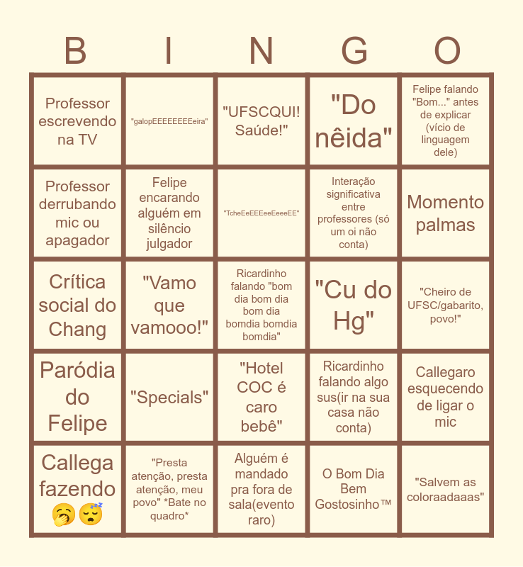This bingo card has 32 words: O Bom Dia Bem Gostosinho™, "Tudo haver ou nada haver?", "Vamo que vamooo!", Adri desligando o mic pra falar, Paródia do Felipe, Felipe encarando alguém em silêncio julgador, Felipe falando "Bom..." antes de explicar (vício de linguagem dele), Callegaro esquecendo de ligar o mic, "galopEEEEEEEEeira", "Salvem as coloraadaaas", "TcheEeEEEeeEeeeEE", "UFSCQUI! Saúde!", "Chama o Miron!", "Eu TE PROPONHO uma DUPLA TROCA nesse momento", "Cu do Hg", "Meeeeu DEUS, como química é fácil", Callega fazendo 🥱😴, Crítica social do Chang, "Hotel COC é caro bebê", "Specials", Ricardinho falando algo sus(ir na sua casa não conta), Ricardinho falando que vai tomar um cafézinho da tarde na sua casa., "Cheiro de UFSC/gabarito, povo!", "Presta atenção, presta atenção, meu povo" *Bate no quadro*, Ricardinho falando "bom dia bom dia bom dia bomdia bomdia bomdia", "Do nêida", Interação significativa entre professores (só um oi não conta), Professor derrubando mic ou apagador, Professor escrevendo na TV, Alguém é mandado pra fora de sala(evento raro), Marcinho tentando irritar alguém and Momento palmas.