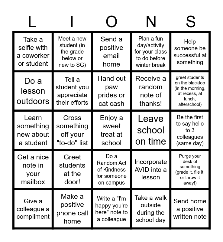 This bingo card has a free space and 24 words: Greet students at the door!, Make a positive phone call home, Hand out paw prides or cat cash, Give a colleague a compliment, Help someone be successful at something, Take a selfie with a coworker or student, Do a lesson outdoors, Meet a new student (in the grade below or new to SG), Leave school on time, Do a Random Act of Kindness for someone on campus, Receive a random note of thanks!, Learn something new about a student, Incorporate AVID into a lesson, Purge your desk of something (grade it, file it, or throw it away!), Tell a student you appreciate their efforts, Take a walk outside during the school day, Be the first to say hello to 3 colleagues (same day), Send a positive email home, greet students on the blacktop (in the morning, at recess, at lunch, afterschool), Cross something off your "to-do" list, Send home a positive written note, Get a nice note in your mailbox, Plan a fun day/activity for your class to do before winter break and Write a "I'm happy you're here" note to a colleague.