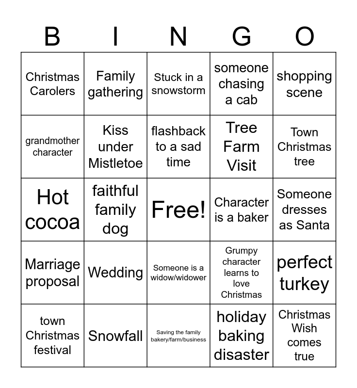 This bingo card has a free space and 30 words: Snowfall, Set primarily in small town, faithful family dog, Character returns to hometown, Christmas Carolers, Stuck in a snowstorm, Kiss under Mistletoe, Someone is a widow/widower, Character is a baker, Saving the family bakery/farm/business, Someone dresses as Santa, Christmas Wish comes true, holiday baking disaster, mysterious magical person who might know Santa, Town Christmas tree, Church service, Grumpy character learns to love Christmas, Marriage proposal, Wedding, shopping scene, Hot cocoa, meaningful gift, Family gathering, Tree Farm Visit, grandmother character, someone chasing a cab, perfect turkey, town Christmas festival, flashback to a sad time and musical montage of characters falling in love.