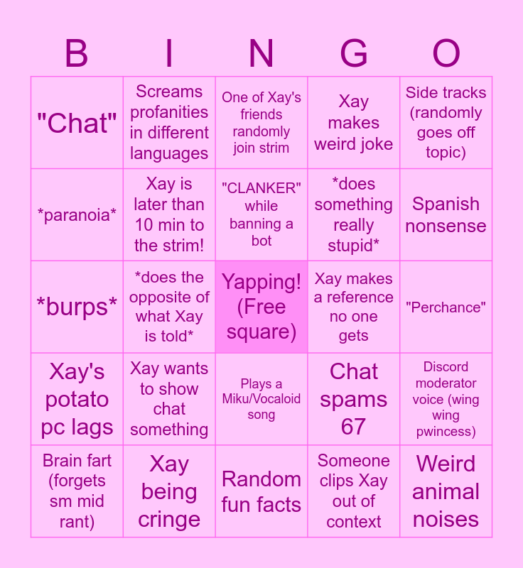 This bingo card has a free space and 44 words: Screaming for no reason, Weird animal noises, Sing stim, Brain fart (forgets sm mid rant), Snapcube/Sonic reference, Someone clips Xay out of context, One of Xay's friends randomly join strim, Technical issues, Side tracks (randomly goes off topic), Xay being cringe, Xay makes weird joke, Xay makes a reference no one gets, Plays a Miku/Vocaloid song, Xay wants to show chat something, Mentions Fortnite or Osu, Random fun facts, Xay gets bored and switches task, *burps*, Eating mid stream, Spanish nonsense, Screams profanities in different languages, Brings us hyperfictions, Stuttering, "Chat", Mixes up names, "Perchance", feet joke, Xay Crash out, Chat spams 67, Xay's potato pc lags, Loose catches strays (Xay makes fun of him), Discord moderator voice (wing wing pwincess), "Puta", "Klootzak", *does the opposite of what Xay is told*, Switching between Png and Vtuber, Xay goes quiet for a solid minute, *starts messing with the vtuber/Png tuber*, "CLANKER" while banning a bot, *paranoia*, *does something really stupid*, Slurpin or sniffin something or someone..., Xay is later than 10 min to the strim! and Xay gets in trouble with the copyright gods.