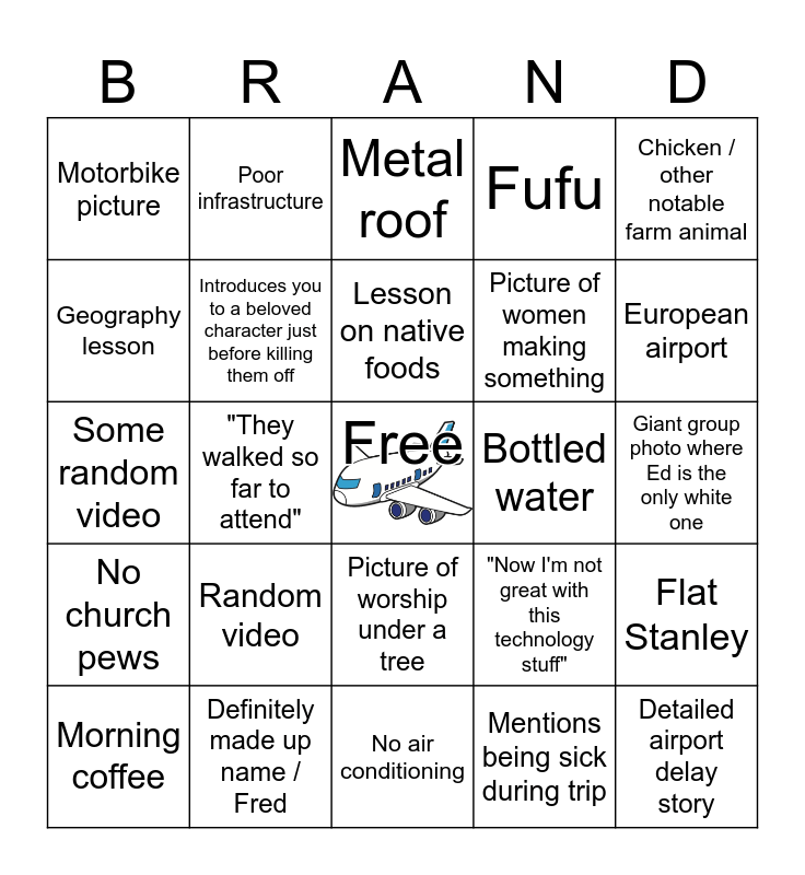 This bingo card has a free space and 27 words: "Now I'm not great with this technology stuff", Dirt floors, Picture of women making something, No air conditioning, Geography lesson, Metal roof, Poor infrastructure, No church pews, Bottled water, Flat Stanley, Some random video, Fufu, Morning coffee, Definitely made up name / Fred, European airport, Shirtless baptism picture, Introduces you to a beloved character just before killing them off, Lesson on native foods, Random video, Motorbike picture, Giant group photo where Ed is the only white one, Mentions being sick during trip, "They walked so far to attend", Detailed airport delay story, Picture of worship under a tree, Chicken / other notable farm animal and Answers his own question.