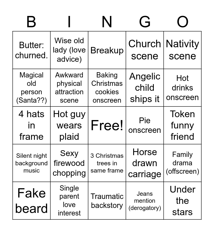 This bingo card has a free space and 26 words: 3 Christmas trees in same frame, Jeans mention (derogatory), Baking Christmas cookies onscreen, Single parent love interest, Nativity scene, Butter: churned., Magical old person (Santa??), Wise old lady (love advice), Token funny friend, Horse drawn carriage, Angelic child ships it, 4 hats in frame, Family drama (offscreen), Fake beard, Hot guy wears plaid, Green and red characters converse, Church scene, Silent night background music, Breakup, Under the stars, Hot drinks onscreen, Traumatic backstory, Pie onscreen, Sexy firewood chopping, Awkward physical attraction scene and Cellphone discourse.