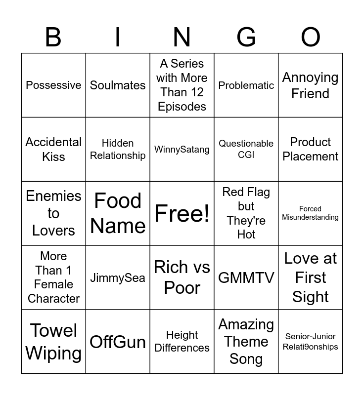 This bingo card has a free space and 24 words: JimmySea, OffGun, WinnySatang, Towel Wiping, Annoying Friend, Possessive, Accidental Kiss, Soulmates, Red Flag but They're Hot, Rich vs Poor, Questionable CGI, Enemies to Lovers, GMMTV, Love at First Sight, Hidden Relationship, Amazing Theme Song, Forced Misunderstanding, A Series with More Than 12 Episodes, Product Placement, Food Name, Senior-Junior Relati9onships, More Than 1 Female Character, Problematic and Height Differences.