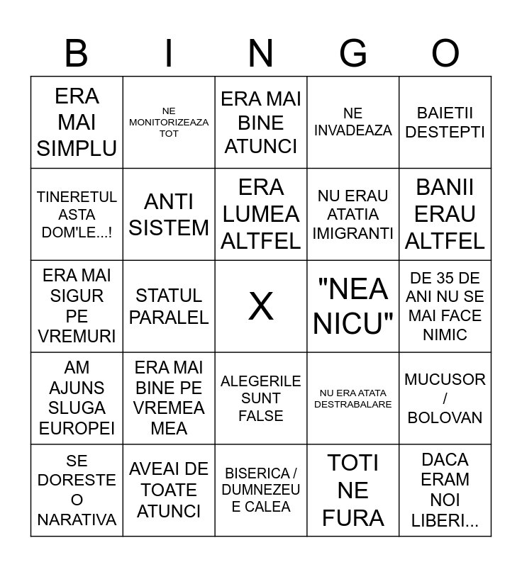 This bingo card has a free space and 24 words: ERA MAI BINE PE VREMEA MEA, AVEAI DE TOATE ATUNCI, ERA LUMEA ALTFEL, SE DORESTE O NARATIVA, BAIETII DESTEPTI, ERA MAI SIMPLU, TINERETUL ASTA DOM'LE...!, NE MONITORIZEAZA TOT, "NEA NICU", ALEGERILE SUNT FALSE, NU ERAU ATATIA IMIGRANTI, ERA MAI SIGUR PE VREMURI, NU ERA ATATA DESTRABALARE, MUCUSOR / BOLOVAN, ANTI SISTEM, TOTI NE FURA, DE 35 DE ANI NU SE MAI FACE NIMIC, ERA MAI BINE ATUNCI, BANII ERAU ALTFEL, STATUL PARALEL, DACA ERAM NOI LIBERI..., AM AJUNS SLUGA EUROPEI, NE INVADEAZA and BISERICA / DUMNEZEU E CALEA.