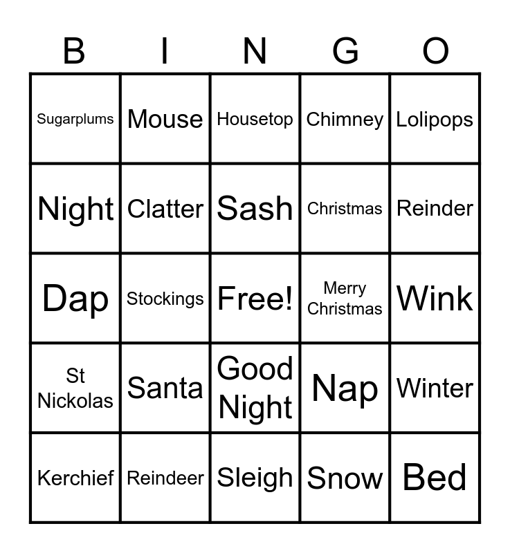 This bingo card has a free space and 24 words: Santa, Reindeer, Sash, Kerchief, Lolipops, Sugarplums, Night, Mouse, Merry Christmas, Good Night, Christmas, Dap, Nap, Winter, Clatter, Snow, Wink, Housetop, Reinder, Stockings, Bed, St Nickolas, Chimney and Sleigh.