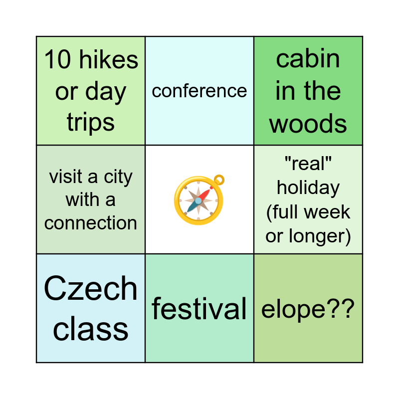 This bingo card has a free space and 8 words: "real" holiday (full week or longer), cabin in the woods, conference, Czech class, 10 hikes or day trips, elope??, visit a city with a connection and festival.