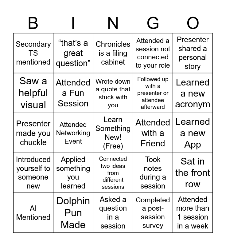 This bingo card has a free space and 29 words: AI Mentioned, Attended EDI led event, Attended Networking Event, Attended a Sonar Session, Secondary TS mentioned, Chronicles is a filing cabinet, Attended a Fun Session, Applied something you learned, Attended with a Friend, Dolphin Pun Made, Learned a new App, Attended more than 1 session in a week, Asked a question in a session, Completed a post-session survey, Learned a new acronym, Had an “aha!” moment, Connected two ideas from different sessions, Introduced yourself to someone new, Presenter shared a personal story, Presenter made you chuckle, Took notes during a session, Recommended a session to a coworker, Followed up with a presenter or attendee afterward, Saw a helpful visual, Attended a session not connected to your role, “that’s a great question”, Sat in the front row, Wrote down a quote that stuck with you and Identified a habit you want to improve.