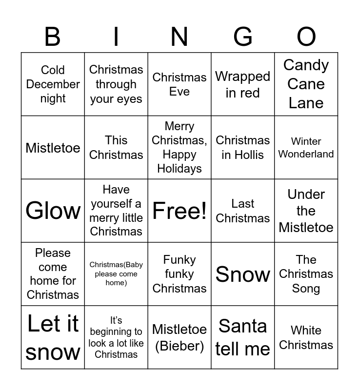 This bingo card has a free space and 78 words: Dear Santa, Favorite time of year, Christmas Eve, Oh Santa!, I’ll be home, You deserve it all, Snowman, What Christmas means to me, Cozy little Christmas, Little Saint Nick, Christmas Everyday, Underneath the tree, Wrapped in red, Cold December night, Santa, can’t you hear me, Mistletoe, Like it’s Christmas, Christmas(Baby please come home), You make it feel like Christmas, Under the Mistletoe, Winter Dreams, Candy Cane Lane, Glow, Merry Christmas, Happy Holidays, This Christmas, National Lampoon’s Christmas Vacation, Happy Xmas(War is over, All I want for Christmas is you, Joy to the world, ROckin Around the Christmas tree, Winter Wonderland, Silent Night Medley, Mistletoe (Bieber), Jingle Bell Rock, Let it snow, Last Christmas, Grown up Christmas List, Deck the Halls, Believe, White Christmas, I’ll be home for Christmas, We need a little Christmas, Mary, did you know, Wonderful Christmastime, What Christas means to me, Christmas through your eyes, Where are you Christmas, Santa Clause is coming to town, Rudolph the red nosed reindeer, Frosty the snowman, The Christmas Song, Have yourself a merry little Christmas, Snow, Feliz Navidad, It’s Christmas time again, This one’s for the Children, I saw mommy kissing Santa Clause, All I want for Christmas is my two front teeth, I want a hippopotamus for Christmas, Funky funky Christmas, Christmas in Hollis, Christmas in Dixie, Christmas Eve/Sarajevo, Christmas Wrap, My only wish this year, Christmas time is here, Merry Christmas, baby, Run run Rudolph, Please come home for Christmas, It’s beginning to look a lot like Christmas, The most wonderful time of the year, Santa Baby, Jingle bell rock, DJ play a Christmas song, Santa tell me, You're a mean one Mr. Grinch, Christmas tree farm and Christmas to me.