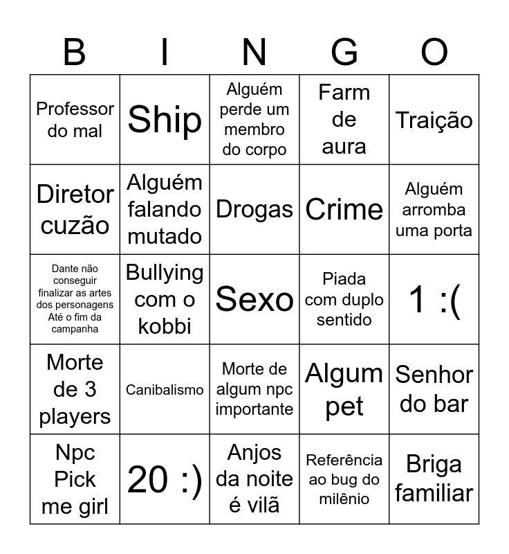 This bingo card has a free space and 24 words: Canibalismo, 20 :), Drogas, Npc Pick me girl, Traição, Professor do mal, Diretor cuzão, Ship, Piada com duplo sentido, Morte de algum npc importante, Crime, Dante não conseguir finalizar as artes dos personagens Até o fim da campanha, Algum pet, Senhor do bar, Alguém falando mutado, Referência ao bug do milênio, 1 :(, Alguém perde um membro do corpo, Alguém arromba uma porta, Bullying com o kobbi, Briga familiar, Morte de 3 players, Farm de aura and Anjos da noite é vilã.