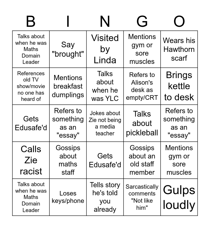 This bingo card has 74 words: Loud Apple Consumption, Mentions Auburn, Visited by Linda, Tells story he's told you already, Loses keys/phone, Visited by a small child, Prints something non-work related, Mentions the video/song, Talks about when he was Maths Domain Leader, Visited by Eilieen, Gossips about maths staff, Borrows a stapler, Talks about when he was YLC, References old TV show/movie no one has heard of, Mentions his former student teacher, Refers to something as an "essay", Gulps loudly, Brings kettle to desk, Asks how to spell a word, Gets Edusafe'd, Mentions breakfast dumplings, Say "brought", Mentions gym or sore muscles, Refers to Alison's desk as empty/CRT, Jokes about Zie not being a media teacher, Calls Zie racist, Mentions the gym, Talks about pickleball, Mentions Block Blast, Mentions Christofidis, Wears his Hawthorn scarf, Gossips about an old staff member, Talks about Golf, Complains about math teachers not knowing how to mark his new assessment, Says "Zray", Sarcastically comments "Not like him", Refers to Beau as a serial killer, Loud Apple Consumption, Mentions Auburn, Visited by Linda, Tells story he's told you already, Loses keys/phone, Visited by a small child, Prints something non-work related, Mentions the video/song, Talks about when he was Maths Domain Leader, Visited by Eilieen, Gossips about maths staff, Borrows a stapler, Talks about when he was YLC, References old TV show/movie no one has heard of, Mentions his former student teacher, Refers to something as an "essay", Gulps loudly, Brings kettle to desk, Asks how to spell a word, Gets Edusafe'd, Mentions breakfast dumplings, Say "brought", Mentions gym or sore muscles, Refers to Alison's desk as empty/CRT, Jokes about Zie not being a media teacher, Calls Zie racist, Mentions the gym, Talks about pickleball, Mentions Block Blast, Mentions Christofidis, Wears his Hawthorn scarf, Gossips about an old staff member, Talks about Golf, Complains about math teachers not knowing how to mark his new assessment, Says "Zray", Sarcastically comments "Not like him" and Refers to Beau as a serial killer.