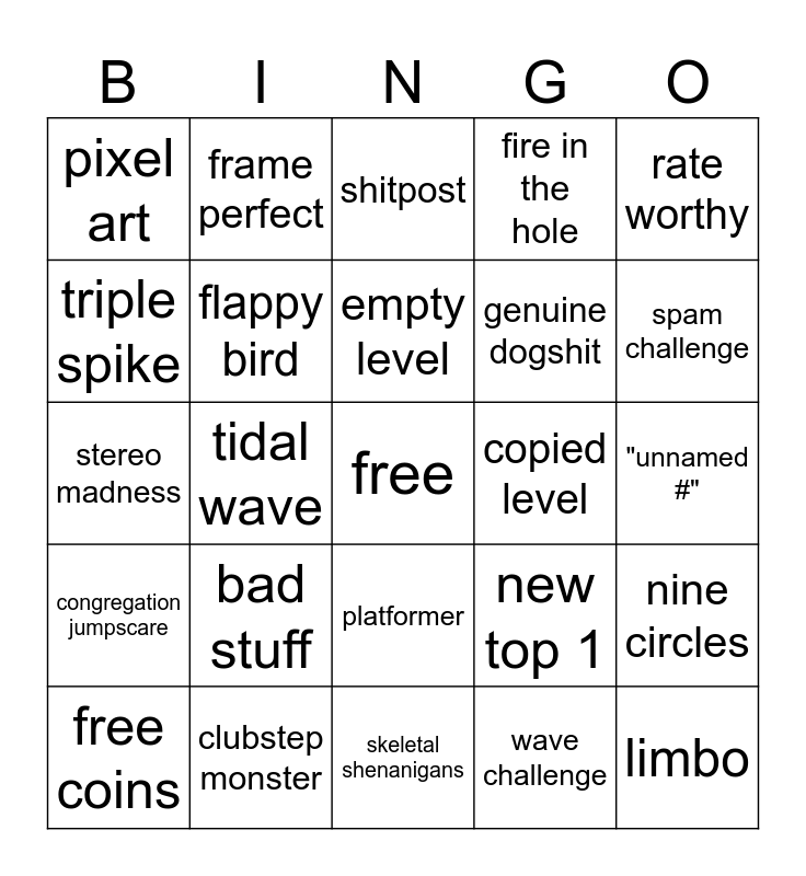 This bingo card has a free space and 24 words: bad stuff, clubstep monster, empty level, free coins, rate worthy, pixel art, triple spike, frame perfect, copied level, platformer, genuine dogshit, stereo madness, new top 1, nine circles, flappy bird, wave challenge, "unnamed #", shitpost, spam challenge, tidal wave, limbo, congregation jumpscare, fire in the hole and skeletal shenanigans.