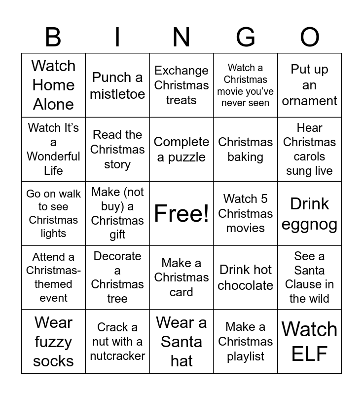 This bingo card has a free space and 26 words: Make a Christmas card, Make a Christmas playlist, Complete a puzzle, Crack a nut with a nutcracker, Put up an ornament, Watch Home Alone, Watch It’s a Wonderful Life, Punch a mistletoe, Drink eggnog, Drink hot chocolate, Christmas baking, Go on walk to see Christmas lights, See a Santa Clause in the wild, Wear fuzzy socks, Make (not buy) a Christmas gift, Injest peppermint in some form, Watch a Christmas movie you’ve never seen, Attend a Christmas-themed event, Exchange Christmas treats, Watch ELF, Hear Christmas carols sung live, Wear a Santa hat, Watch 5 Christmas movies, Decorate a Christmas tree, Read the Christmas story and Wear Christmas pyjamas.