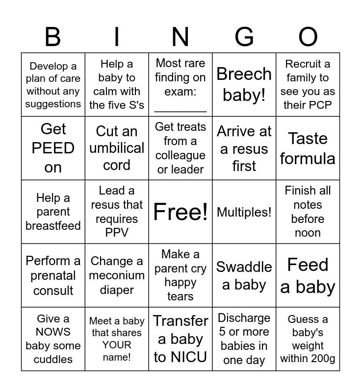 This bingo card has a free space and 24 words: Change a meconium diaper, Meet a baby that shares YOUR name!, Get treats from a colleague or leader, Give a NOWS baby some cuddles, Recruit a family to see you as their PCP, Develop a plan of care without any suggestions, Get PEED on, Help a baby to calm with the five S's, Multiples!, Make a parent cry happy tears, Arrive at a resus first, Help a parent breastfeed, Swaddle a baby, Feed a baby, Cut an umbilical cord, Discharge 5 or more babies in one day, Finish all notes before noon, Most rare finding on exam: ________, Taste formula, Lead a resus that requires PPV, Guess a baby's weight within 200g, Perform a prenatal consult, Breech baby! and Transfer a baby to NICU.