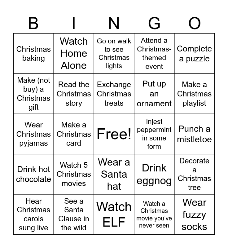 This bingo card has a free space and 24 words: Watch 5 Christmas movies, See a Santa Clause in the wild, Exchange Christmas treats, Hear Christmas carols sung live, Complete a puzzle, Christmas baking, Make (not buy) a Christmas gift, Watch Home Alone, Injest peppermint in some form, Wear a Santa hat, Put up an ornament, Wear Christmas pyjamas, Drink eggnog, Decorate a Christmas tree, Read the Christmas story, Watch a Christmas movie you’ve never seen, Punch a mistletoe, Go on walk to see Christmas lights, Make a Christmas playlist, Make a Christmas card, Wear fuzzy socks, Drink hot chocolate, Attend a Christmas-themed event and Watch ELF.