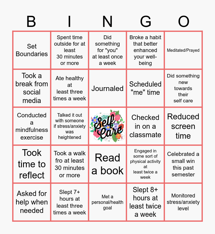 This bingo card has a free space and 24 words: Took a walk fro at least 30 minutes or more, Slept 7+ hours at least three times a week, Journaled, Asked for help when needed, Meditated/Prayed, Set Boundaries, Took a break from social media, Spent time outside for at least 30 minutes or more, Checked in on a classmate, Read a book, Scheduled "me" time, Conducted a mindfulness exercise, Engaged in some sort of physical activity at least twice a week, Celebrated a small win this past semester, Ate healthy at least three times a week, Slept 8+ hours at least twice a week, Reduced screen time, Did something for "you" at least once a week, Did something new towards their self care, Talked it out with someone if stress/anxiety was heightened, Monitored stress/anxiety level, Took time to reflect, Broke a habit that better enhanced your well-being and Met a personal/health goal.