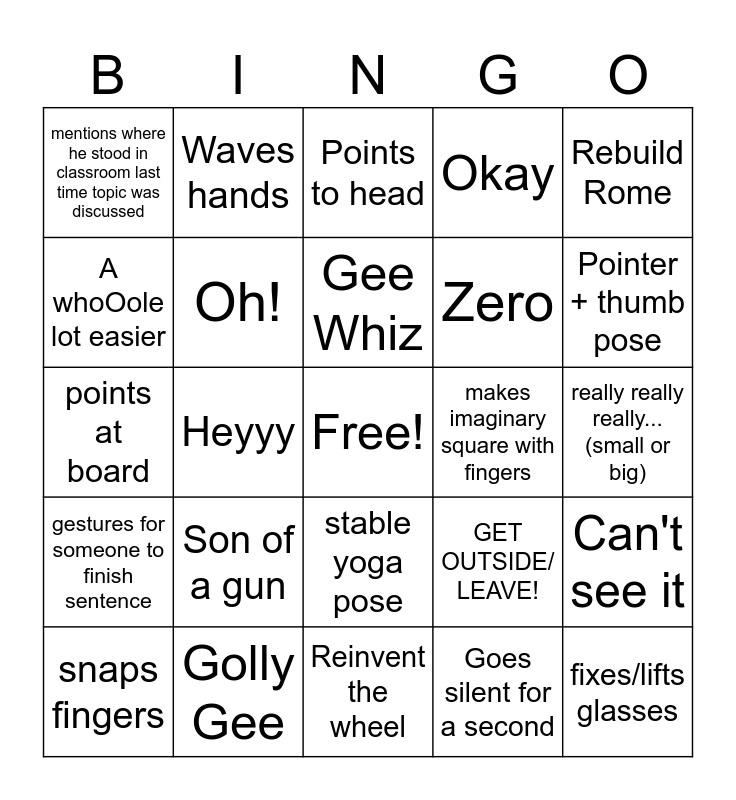 This bingo card has a free space and 24 words: Son of a gun, Golly Gee, Gee Whiz, snaps fingers, Rebuild Rome, mentions where he stood in classroom last time topic was discussed, A whoOole lot easier, Waves hands, makes imaginary square with fingers, stable yoga pose, Zero, points at board, GET OUTSIDE/ LEAVE!, Can't see it, Oh!, Goes silent for a second, really really really...(small or big), Points to head, Pointer + thumb pose, Heyyy, fixes/lifts glasses, gestures for someone to finish sentence, Okay and Reinvent the wheel.