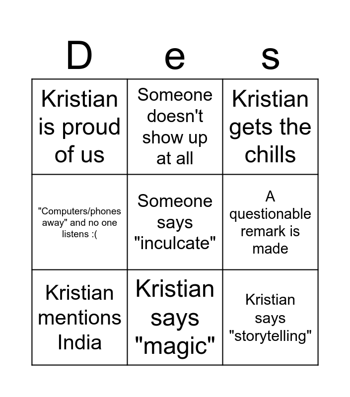 This bingo card has 15 words: Kristian says 'be more present', Someone is 45+ min late, Kristian gets the chills, Kristian is proud of us, Kristian says "magic", Someone says "inculcate", Hand cupping ear motion, Kristian says "feel your feet", A questionable remark is made, Kristian says "storytelling", Someone rolls their eyes, "Computers/phones away" and no one listens :(, Kristian mentions India, Someone doesn't show up at all and Kristian does this motion thing 🤘.