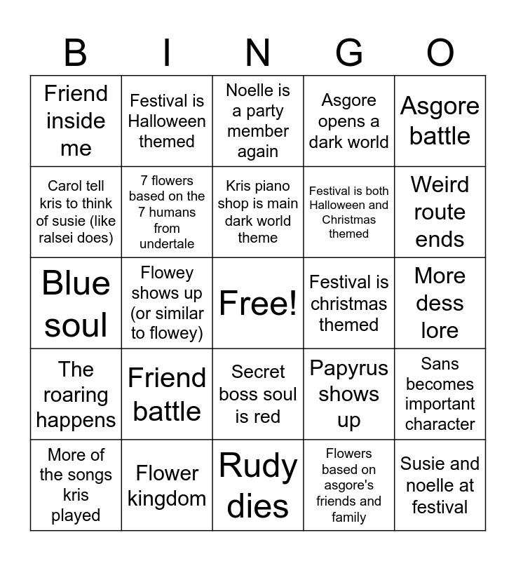 This bingo card has a free space and 24 words: Friend battle, Flower kingdom, Kris piano shop is main dark world theme, More of the songs kris played, Asgore battle, Friend inside me, Carol tell kris to think of susie (like ralsei does), Festival is Halloween themed, Festival is christmas themed, Secret boss soul is red, Festival is both Halloween and Christmas themed, Blue soul, Papyrus shows up, Sans becomes important character, 7 flowers based on the 7 humans from undertale, Flowers based on asgore's friends and family, More dess lore, Noelle is a party member again, Weird route ends, Flowey shows up (or similar to flowey), Susie and noelle at festival, The roaring happens, Asgore opens a dark world and Rudy dies.