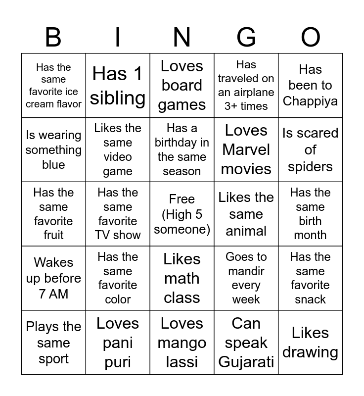 This bingo card has a free space and 24 words: Has the same favorite color, Loves pani puri, Has a birthday in the same season, Plays the same sport, Has been to Chappiya, Has the same favorite ice cream flavor, Is wearing something blue, Has 1 sibling, Likes the same animal, Likes math class, Loves Marvel movies, Has the same favorite fruit, Goes to mandir every week, Has the same favorite snack, Likes the same video game, Can speak Gujarati, Has the same birth month, Loves board games, Is scared of spiders, Has the same favorite TV show, Likes drawing, Wakes up before 7 AM, Has traveled on an airplane 3+ times and Loves mango lassi.