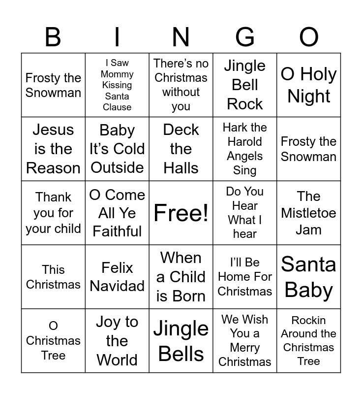 This bingo card has a free space and 48 words: All I Want for Christmas is You, Rockin Around the Christmas Tree, Silent Night, Jingle Bells, Felix Navidad, Santa Claus is Coming to Town, I Saw Mommy Kissing Santa Clause, Silver Bells, Jesus is the Reason, Run Rudolph Run, Baby It’s Cold Outside, Jingle Bell Rock, Santa Baby, I’ll Be Home For Christmas, It’s a beginning to look a lot like Christmas, Let it Snow, Deck the Halls, Do You Hear What I hear, Little Drummer Boy, O Holy Night, O Come All Ye Faithful, We Wish You a Merry Christmas, Frosty the Snowman, Hark the Harold Angels Sing, What a Wonderful World, Frosty the Snowman, O Christmas Tree, Every Year, Every Christmas, When a Child is Born, This Christmas, Have Yourself a Merry Little Christmas, Give Love at Christmas, Give Love on Christmas Day, Who Would Imagine a King, Joy to the World, Rudolph the Red Nose Reindeer, Someday At Christmas, The Mistletoe Jam, Please Come Home for Christmas, Now Behold the Lamb, Jesus is the Reason for the Season, Go Tell it on the Mountain, There’s no Christmas without you, The night that Christ was born, Thank you for your child, The First Noel, Away in a manger and The Christmas Song.