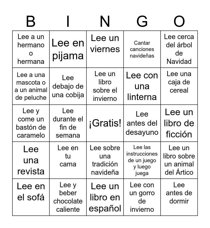 This bingo card has a free space and 24 words: Lee en tu cama, Lee y beber chocolate caliente, Lee un libro sobre el invierno, Lee en el sofá, Lee cerca del árbol de Navidad, Lee a un hermano o hermana, Lee a una mascota o a un animal de peluche, Lee en pijama, Lee antes del desayuno, Lee sobre una tradición navideña, Lee con una linterna, Lee y come un bastón de caramelo, Lee las instrucciones de un juego y luego juega, Lee un libro sobre un animal del Ártico, Lee debajo de una cobija, Lee con un gorro de invierno, Lee un libro de ficción, Lee un viernes, Lee una caja de cereal, Lee durante el fin de semana, Lee antes de dormir, Lee una revista, Cantar canciones navideñas and Lee un libro en español.
