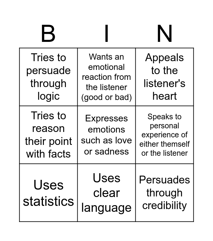 This bingo card has a free space and 9 words: Uses statistics, Wants an emotional reaction from the listener (good or bad), Speaks to personal experience of either themself or the listener, Tries to persuade through logic, Appeals to the listener's heart, Tries to reason their point with facts, Uses clear language, Persuades through credibility and Wants an emotional reaction from the listener (good or bad).