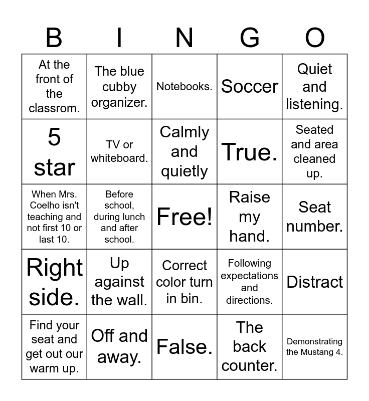 This bingo card has a free space and 24 words: Up against the wall., Off and away., Calmly and quietly, Find your seat and get out our warm up., Quiet and listening., At the front of the classrom., 5 star, The blue cubby organizer., Raise my hand., Correct color turn in bin., True., When Mrs. Coelho isn't teaching and not first 10 or last 10., Following expectations and directions., Distract, TV or whiteboard., The back counter., Seat number., Notebooks., Seated and area cleaned up., Before school, during lunch and after school., Demonstrating the Mustang 4., Right side., Soccer and False..