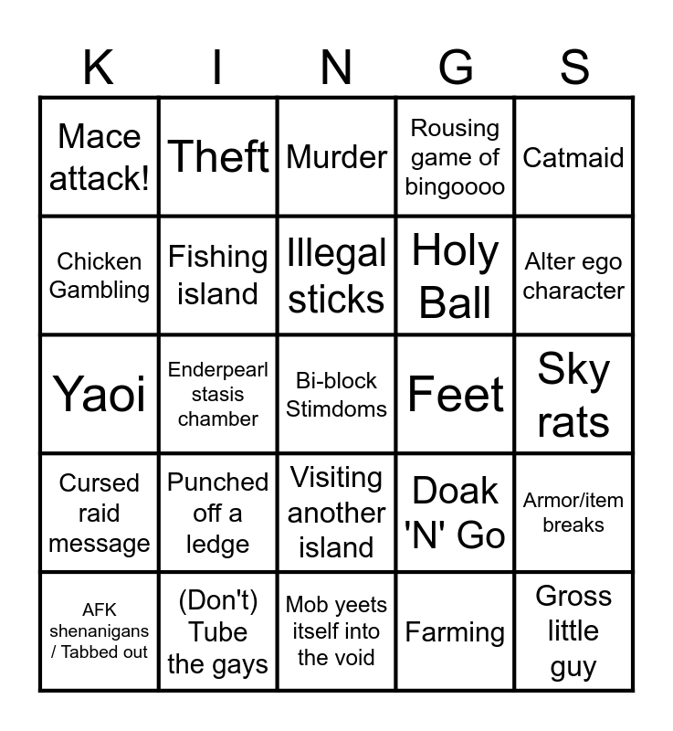 This bingo card has a free space and 81 words: Feeding the void, Fish Gaming Wednesday, Murder, Spleefing, Yuri, Marmarmarmarm, Avid music, Doooooovid, Item Monopoly Mention, Terraforming, Clump / Clümp, Infrastructure (Roads, DMV, etc), Rousing game of bingoooo, Mace attack!, Word ban, Chicken Gambling, Contraband saplings, Punched off a ledge, Good morninggg!!!!, Sky rats, Identity theft, Catmaid, Yaoi, Illegal sticks, Fishing island, Messing around with somebody else's skull, Wandering villager, Nancart, Cat spotted, Dog spotted, Alter ego character, Elffe fish, Mob yeets itself into the void, Accidental mob spawner, AFK shenanigans / Tabbed out, Feet, "Back to the pee topic", Lore!, Trapdoors, The Backrooms, Gross little guy, Legally distinct pocket creature, Group meowing, Flirting, Enderpearl stasis chamber, Rescue needed, Theft, Forgot to turn on/off flashback recording, Wrong streaming/recording status, Local cryptid, Doak 'N' Go, Armor/item breaks, Costco, Doovid Meal, Skyblock's Five (Six) (Seven) Rules, Craigs, "Family friendly", Copper golem, Fly-by, Messing with other skyheads, Visiting another island, Doovid difference, Bald, The bank is not open, INDEED!!!!, Token Straight / Diversity Hire, New shop at spawn, Six-Seven, Skibidi, Honorary SBK member in chat (Musi, etc), Rip the mods, Cursed raid message, (Don't) Tube the gays, Season 1 Reference, Singing, Doing an accent, Muted, Farming, Leon lingo, Holy Ball and That sure is... a shape..