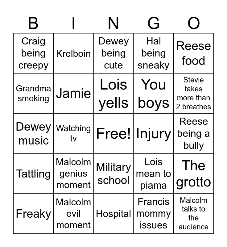 This bingo card has a free space and 24 words: Malcolm genius moment, Malcolm evil moment, Lois yells, Freaky, Reese food, Craig being creepy, Grandma smoking, Krelboin, Injury, Military school, You boys, Dewey music, Lois mean to piama, The grotto, Jamie, Francis mommy issues, Reese being a bully, Dewey being cute, Stevie takes more than 2 breathes, Watching tv, Malcolm talks to the audience, Tattling, Hal being sneaky and Hospital.