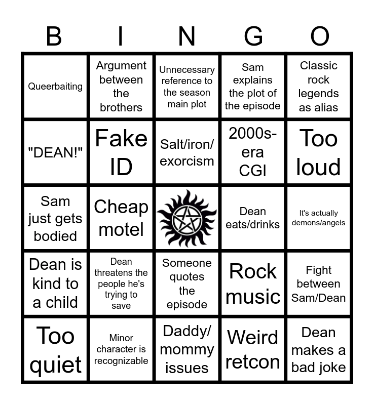 This bingo card has a free space and 49 words: Bad karma, Dean makes a bad joke, Door kicked down, Daddy/ mommy issues, Dean threatens the people he's trying to save, Dean flirting, Argument between the brothers, 1st suspect is not the right one, "DEAN!", Someone gets captured, Fake ID, Sam explains the plot of the episode, Fight between Sam/Dean, Rock music, Horror movie cliché, Chase scene, Salt/iron/ exorcism, Dean eats/drinks, "SAMMY!", Classic rock legends as alias, Cheap motel, Weird retcon, Queerbaiting, 2000s-era CGI, Violent death shown in detail, Too loud, Too quiet, Sam is the only one not repressing issues, Someone quotes the episode, Dean is kind to a child, Chaotic quotes, "Idjit", Surprisingly beautiful imagery, Single man tear, Minor character is recognizable, Someone dies, again, Overly confusing plot, Emotional roller coaster, It's actually demons/angels, You cant just say that Dean, Goofy side character, ACTUAL racism, Baby being Dean's only true love, Possessed person just straight up dies, Sam just gets bodied, Unnecessary reference to the season main plot, Tumblr gif, Nod to the fans and Sam gets a computer signal where he shouldn't.