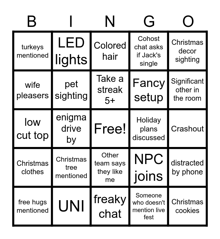 This bingo card has a free space and 24 words: Christmas tree mentioned, UNI, Take a streak 5+, free hugs mentioned, Christmas decor sighting, turkeys mentioned, wife pleasers, LED lights, Holiday plans discussed, Other team says they like me, Fancy setup, low cut top, NPC joins, distracted by phone, pet sighting, Someone who doesn't mention live fest, Crashout, Colored hair, Significant other in the room, enigma drive by, Christmas cookies, Christmas clothes, Cohost chat asks if Jack's single and freaky chat.