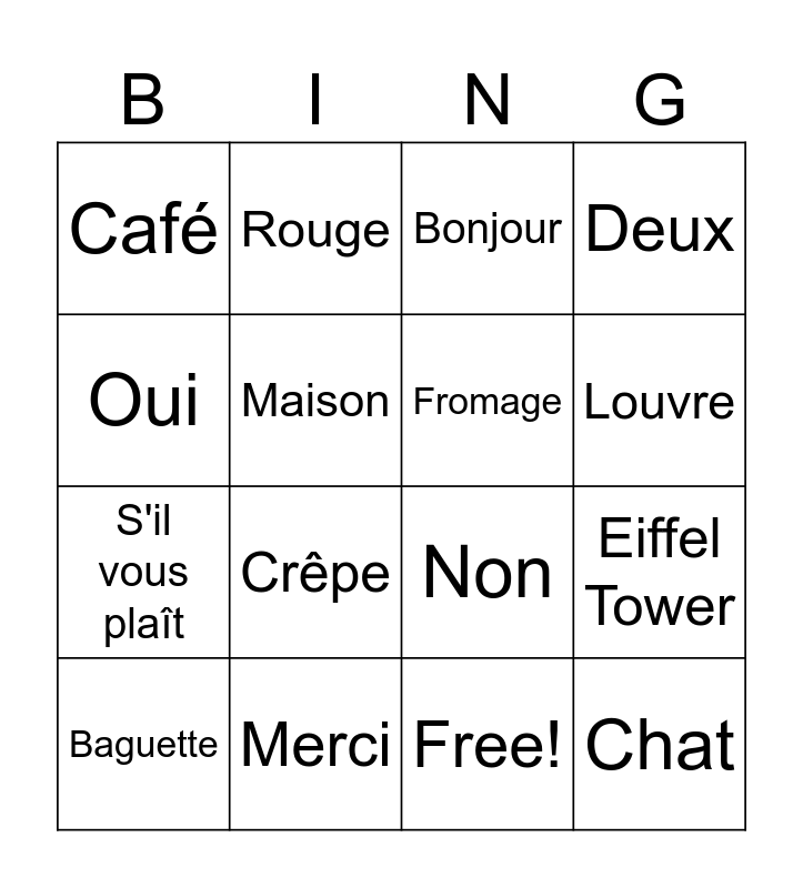 This bingo card has 17 words: Free!, Baguette, Bonjour, Café, Crêpe, Deux, Eiffel Tower, Fromage, Louvre, Maison, Merci, Non, Oui, Rouge, S'il vous plaît, Vert and Chat.