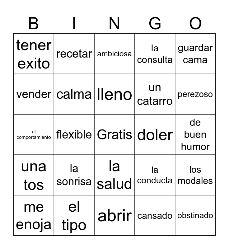 This bingo card has a free space and 24 words: la sonrisa, el tipo, lleno, me enoja, guardar cama, tener exito, vender, recetar, doler, la salud, un catarro, el comportamiento, la conducta, los modales, calma, cansado, de buen humor, ambiciosa, perezoso, flexible, obstinado, una tos, la consulta and abrir.