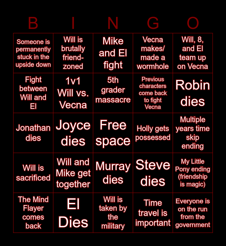 This bingo card has a free space and 24 words: Will and Mike get together, El Dies, 5th grader massacre, The Mind Flayer comes back, Will, 8, and El team up on Vecna, Someone is permanently stuck in the upside down, Fight between Will and El, Will is brutally friend-zoned, Holly gets possessed, Murray dies, Previous characters come back to fight Vecna, Jonathan dies, Steve dies, My Little Pony ending (friendship is magic), 1v1 Will vs. Vecna, Time travel is important, Multiple years time skip ending, Mike and El fight, Robin dies, Joyce dies, Everyone is on the run from the government, Will is sacrificed, Vecna makes/ made a wormhole and Will is taken by the military.
