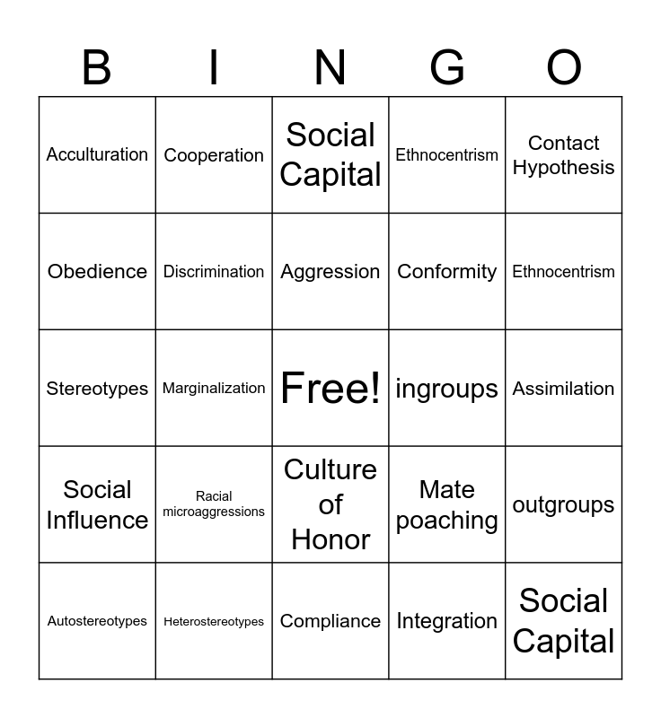 This bingo card has a free space and 27 words: Mate poaching, Arranged marriage, Conformity, Compliance, Obedience, Social Capital, Cooperation, Social Influence, ingroups, outgroups, Stereotypes, Ethnocentrism, Autostereotypes, Heterostereotypes, Ethnocentrism, Prejudice, Discrimination, Aggression, Racial microaggressions, Acculturation, Assimilation, Integration, Marginalization, Social Capital, Culture of Honor, Contact Hypothesis and Arranged Marriage.