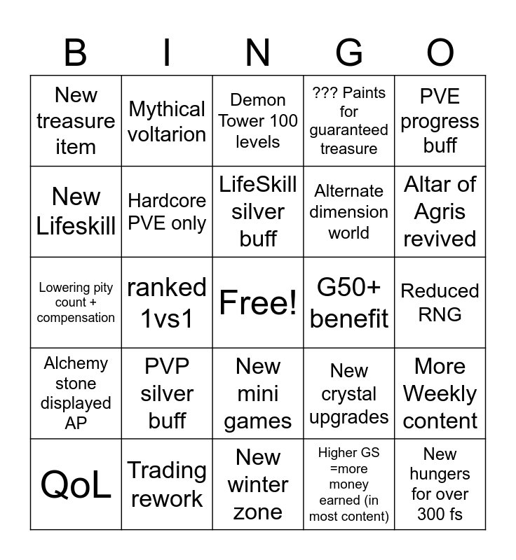 This bingo card has a free space and 24 words: PVP silver buff, Trading rework, LifeSkill silver buff, QoL, PVE progress buff, New treasure item, New Lifeskill, Mythical voltarion, G50+ benefit, New mini games, Alternate dimension world, Lowering pity count + compensation, New crystal upgrades, More Weekly content, Hardcore PVE only, Higher GS =more money earned (in most content), Reduced RNG, Demon Tower 100 levels, Altar of Agris revived, ranked 1vs1, New hungers for over 300 fs, Alchemy stone displayed AP, ??? Paints for guaranteed treasure and New winter zone.