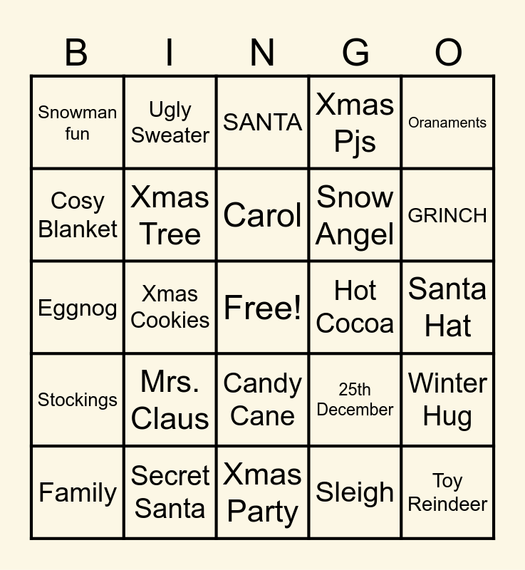 This bingo card has a free space and 34 words: Gingerbread, Sleigh, Wreath, Mulled Wine, Stockings, Xmas Tree, Oranaments, Family, Ugly Sweater, Christmas, Carol, SANTA, Jingle Bells, Fireplace, Hot Cocoa, GRINCH, Secret Santa, Eggnog, Mrs. Claus, 25th December, Candy Cane, Holiday Bonus, Snowman fun, Santa Hat, Xmas Party, Toy Reindeer, Xmas Pjs, Frosty Night, Snow Angel, Cosy Blanket, Gift Wrap, Xmas Cookies, Winter Hug and Xmas Party.