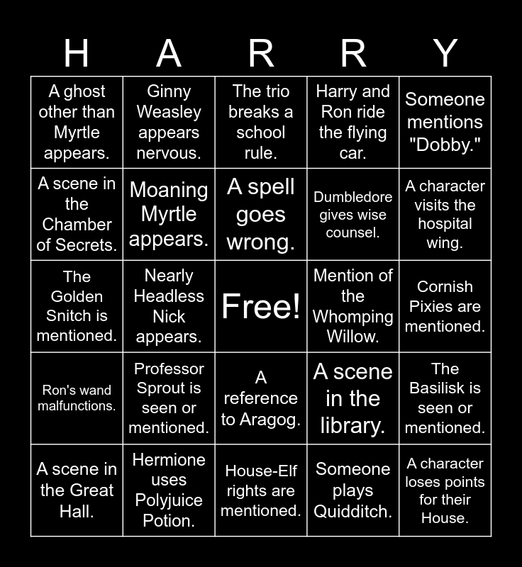 This bingo card has a free space and 60 words: Harry speaks Parseltongue., Hermione uses Polyjuice Potion., A character mentions "Muggle-borns.", Ron's wand malfunctions., Someone plays Quidditch., Hagrid gives advice., Moaning Myrtle appears., A scene in the Forbidden Forest., Dumbledore gives wise counsel., Gilderoy Lockhart boasts about himself., Harry and Ron ride the flying car., The term "Heir of Slytherin" is mentioned., A scene in the Chamber of Secrets., The Sorting Hat appears., Mention of Tom Riddle's diary., A ghost other than Myrtle appears., A character loses points for their House., Someone mentions "Dobby.", Snape looks suspicious., A spell goes wrong., Mention of the Whomping Willow., The trio breaks a school rule., A scene in the Great Hall., The Basilisk is seen or mentioned., Harry uses the Invisibility Cloak., A character receives a Howler., A potion is brewed or mentioned., The Ford Anglia is seen., A character visits the hospital wing., A scene in McGonagall's classroom., Harry gets a detention., The Dueling Club is mentioned or shown., A scene in the Slytherin common room., The Weasley's Burrow is shown., Ginny Weasley appears nervous., A mention of "Mandrakes.", Colin Creevey takes a photo., Nearly Headless Nick appears., A scene in Hagrid's hut., The Golden Snitch is mentioned., The Sword of Gryffindor is referenced., Professor Sprout is seen or mentioned., Cornish Pixies are mentioned., The Deathday Party is mentioned., A scene in the library., Professor Flitwick appears., A character mentions "Petrification.", The Mirror of Erised is mentioned., Fawkes the Phoenix is mentioned., A reference to Aragog., House-Elf rights are mentioned., A character uses a broomstick., Mention of "Parseltongue.", Lucius Malfoy appears., Reference to the previous year's events., Someone uses Floo Powder., A scene involving a spell book., Reference to Gryffindor House., A character says "Expelliarmus." and A scene with Professor Lockhart teaching..