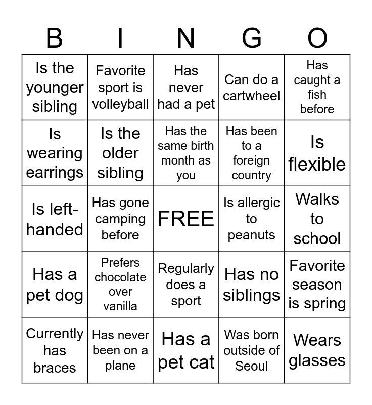 This bingo card has a free space and 24 words: Prefers chocolate over vanilla, Has never been on a plane, Has the same birth month as you, Currently has braces, Has caught a fish before, Is the younger sibling, Is wearing earrings, Favorite sport is volleyball, Is allergic to peanuts, Regularly does a sport, Has been to a foreign country, Is left-handed, Has no siblings, Favorite season is spring, Is the older sibling, Was born outside of Seoul, Walks to school, Has never had a pet, Is flexible, Has gone camping before, Wears glasses, Has a pet dog, Can do a cartwheel and Has a pet cat.