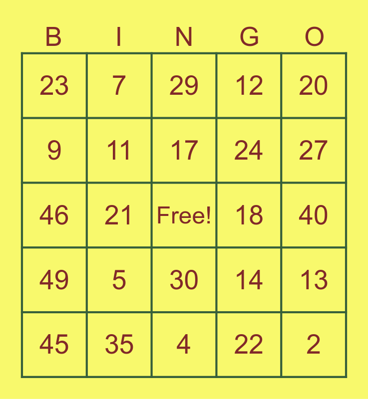This bingo card has a free space and 50 words: 1, 2, 3, 4, 5, 6, 7, 8, 9, 10, 11, 12, 13, 14, 15, 16, 17, 18, 19, 20, 21, 22, 23, 24, 25, 26, 27, 28, 29, 30, 31, 32, 33, 34, 35, 36, 37, 38, 39, 40, 41, 42, 43, 44, 45, 46, 47, 48, 49 and 50.