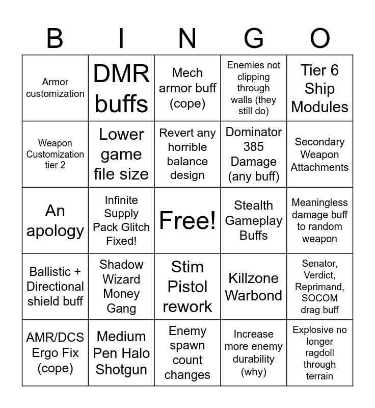 This bingo card has a free space and 24 words: Shadow Wizard Money Gang, Medium Pen Halo Shotgun, Revert any horrible balance design, AMR/DCS Ergo Fix (cope), Tier 6 Ship Modules, Armor customization, Weapon Customization tier 2, DMR buffs, Stealth Gameplay Buffs, Stim Pistol rework, Dominator 385 Damage (any buff), An apology, Killzone Warbond, Senator, Verdict, Reprimand, SOCOM drag buff, Lower game file size, Increase more enemy durability (why), Meaningless damage buff to random weapon, Mech armor buff (cope), Secondary Weapon Attachments, Infinite Supply Pack Glitch Fixed!, Explosive no longer ragdoll through terrain, Ballistic + Directional shield buff, Enemies not clipping through walls (they still do) and Enemy spawn count changes.