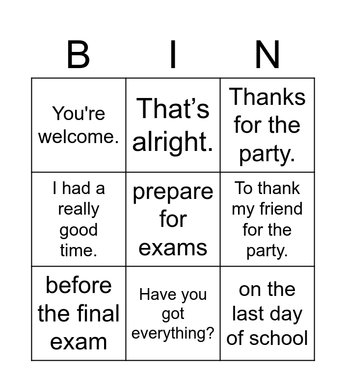 This bingo card has 18 words: new clothes and a board game, during a family meal, Thanks for the party., You're welcome., Free!, I had a really good time., I really enjoyed the party., That’s alright., Have you got everything?, on the last day of school, enjoy the time after the exam, prepare for exams, give sweets, To thank my friend for the party., before the final exam, get money from grandparents, Glad you enjoyed it. and Thanks for inviting me..