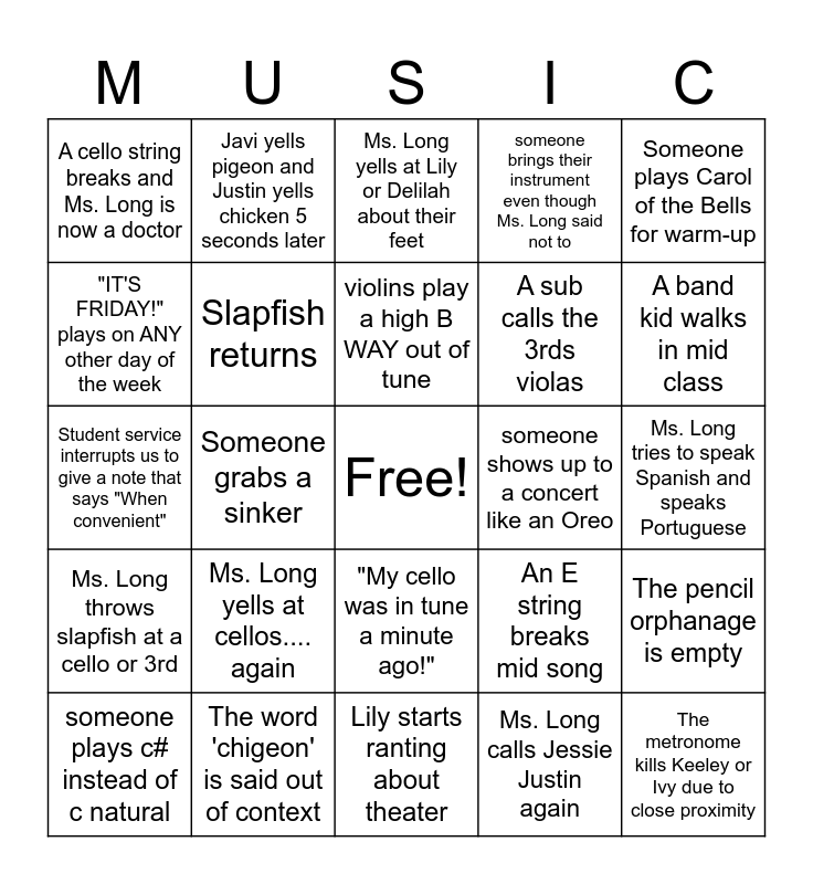 This bingo card has a free space and 24 words: Ms. Long yells at cellos.... again, The word 'chigeon' is said out of context, violins play a high B WAY out of tune, someone plays c# instead of c natural, Someone plays Carol of the Bells for warm-up, A cello string breaks and Ms. Long is now a doctor, "IT'S FRIDAY!" plays on ANY other day of the week, Javi yells pigeon and Justin yells chicken 5 seconds later, someone shows up to a concert like an Oreo, "My cello was in tune a minute ago!", A sub calls the 3rds violas, Student service interrupts us to give a note that says "When convenient", An E string breaks mid song, The pencil orphanage is empty, Slapfish returns, Ms. Long calls Jessie Justin again, Ms. Long tries to speak Spanish and speaks Portuguese, Ms. Long yells at Lily or Delilah about their feet, A band kid walks in mid class, Someone grabs a sinker, The metronome kills Keeley or Ivy due to close proximity, Ms. Long throws slapfish at a cello or 3rd, someone brings their instrument even though Ms. Long said not to and Lily starts ranting about theater.