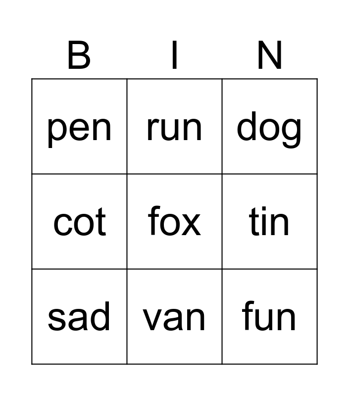 This bingo card has 9 words: sad, dog, run, cot, pen, tin, fox, fun and van.