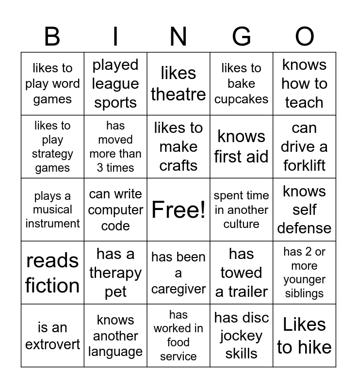This bingo card has a free space and 24 words: has a therapy pet, knows another language, likes to make crafts, is an extrovert, knows how to teach, likes to play word games, likes to play strategy games, played league sports, spent time in another culture, has been a caregiver, knows first aid, plays a musical instrument, has towed a trailer, has 2 or more younger siblings, has moved more than 3 times, has disc jockey skills, knows self defense, likes theatre, can drive a forklift, can write computer code, Likes to hike, reads fiction, likes to bake cupcakes and has worked in food service.