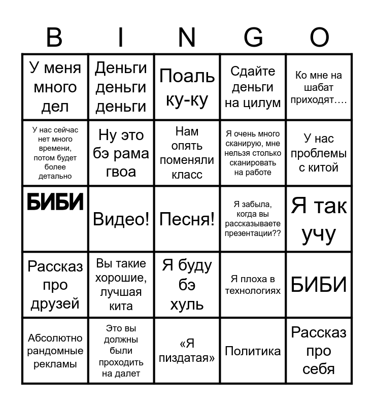 This bingo card has a free space and 24 words: Вы такие хорошие, лучшая кита, Это вы должны были проходить на далет, Нам опять поменяли класс, Абсолютно рандомные рекламы, Ко мне на шабат приходят…., У меня много дел, У нас сейчас нет много времени, потом будет более детально, Деньги деньги деньги, Я забыла, когда вы рассказываете презентации??, Я буду бэ хуль, Я очень много сканирую, мне нельзя столько сканировать на работе, БИБИ, Я плоха в технологиях, БИБИ, Ну это бэ рама гвоа, Политика, Я так учу, Поаль ку-ку, У нас проблемы с китой, Видео!, Рассказ про себя, Рассказ про друзей, Сдайте деньги на цилум and «Я пиздатая».